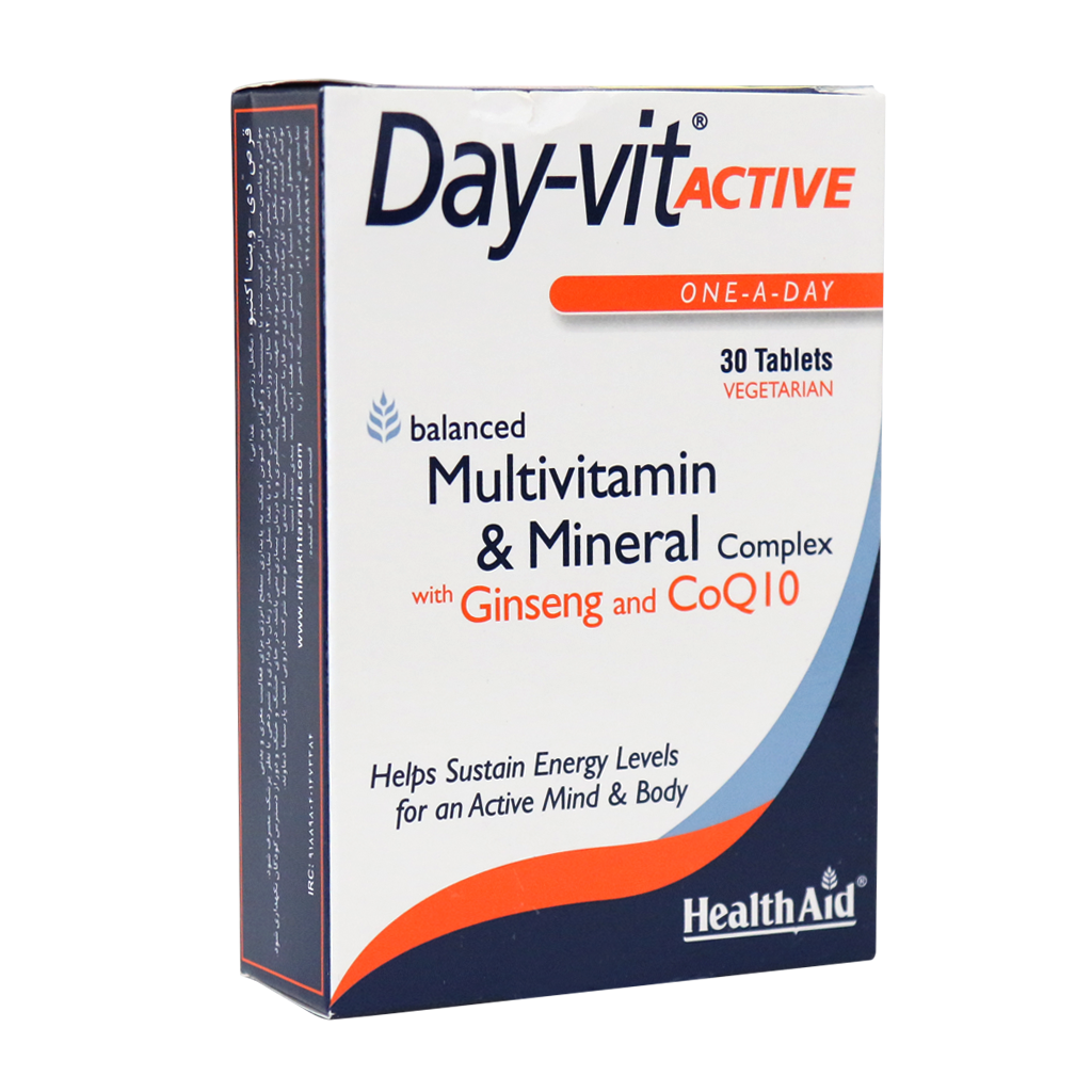 قرص دی ویت اکتیو كمپاني Health Aid تركيب متعادلي از ويتامين ها ، موادمعدني ، اسيدهاي آمينه ، كوآنزيم Q10 و جين سينگ است ، كه براي بهبود و حفظ سلامتي و شادابي بدن فرموله شده است.