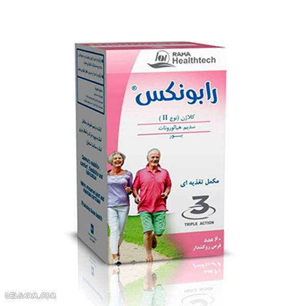 قرص رابونکس رها حاوی ترکیبات ضروری (کلاژن، سدیم هیالورونات و برون) جهت درمان ناراحتیهای استخوانی، بهبود دردهای مفصلی و بهبود عملکرد استخوانها و مفاصل است.
